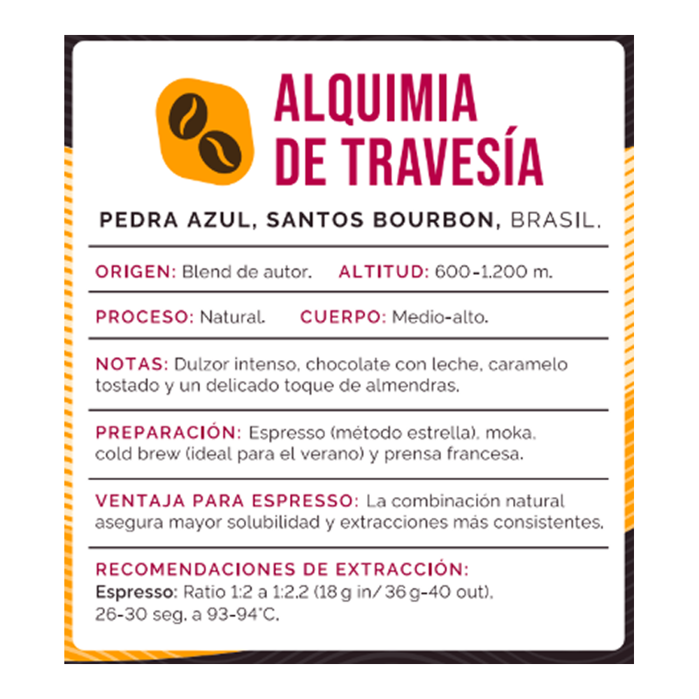 Un blend de autor nacido en Pedra Azul, elaborado con variedad Santos Bourbon y procesado naturalmente para resaltar toda su dulzura. Tiene cuerpo medio-alto y un perfil muy goloso.