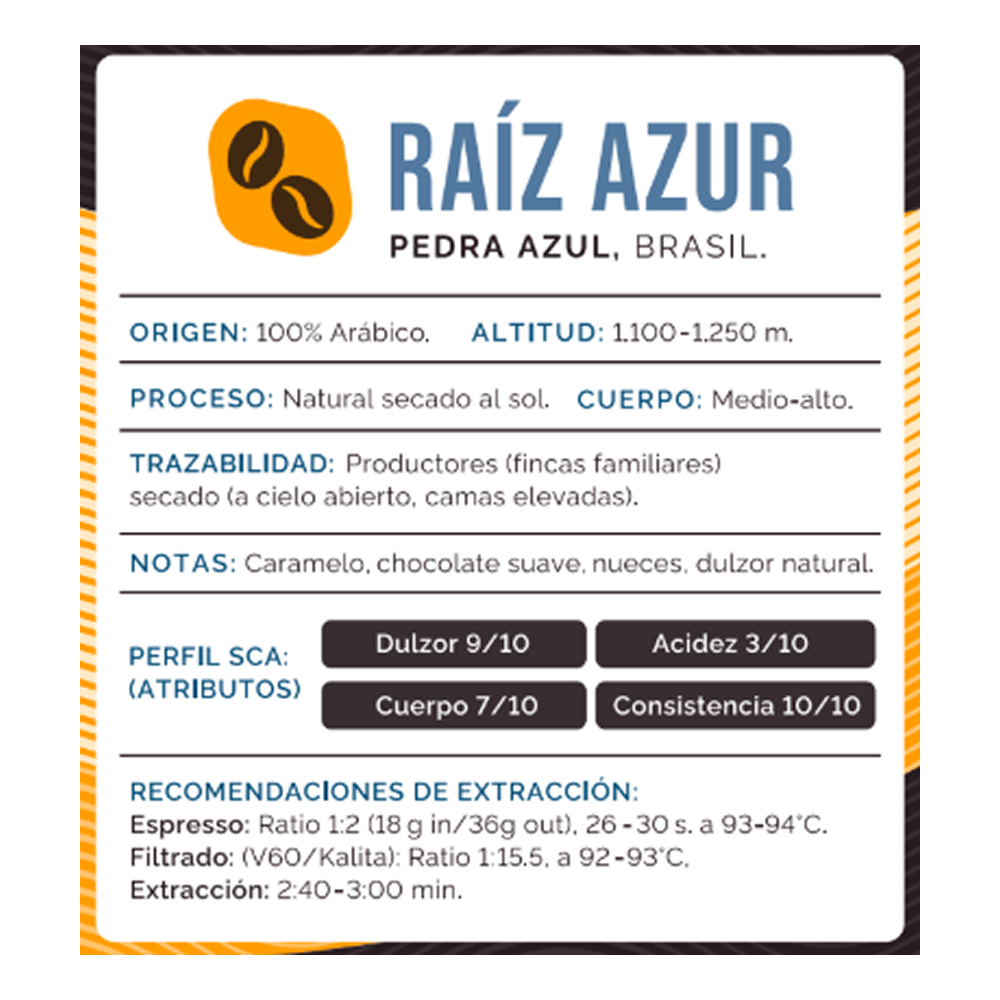 Un café 100% Arábico proveniente de fincas familiares en Pedra Azul, donde se seca a cielo abierto y a gran altura para potenciar su dulzor natural y su cuerpo. Su proceso natural y secado al sol dan como resultado un perfil equilibrado, goloso y muy fácil de disfrutar.